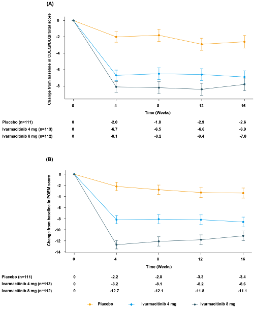 在第16周,与安慰剂组校正后的银屑病生活质量指数(DLQI)/儿童皮肤病生活质量指数(CDLQI)评分最小二乘均值(LS mean)变化分别为:硫酸艾玛昔替尼片4 mg组-4.4(P<0.001),8 mg组-5.2(P<0.001)。与安慰剂组校正后的患者湿疹自我检查评分(POEM)的LS mean变化为:艾玛昔替尼4 mg组-5.2(P<0.001),8 mg组-7.7(P<0.001)。从第4周到第16周,两个艾玛昔替尼组的DLQI/CDLQI和POEM评分均显著降低。